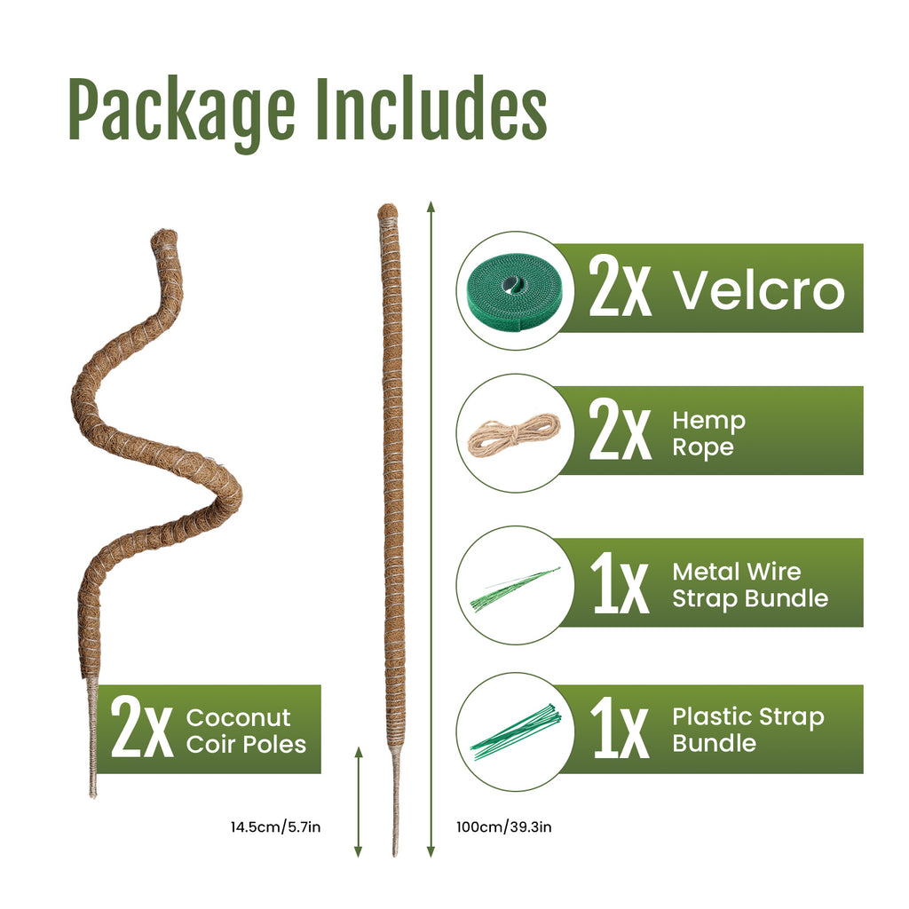 Pakage Included:2 x 100cm Coir Pole for optimized plant support, 2 x Durable Hemp Rope for additional plant tie points,1 x Metal Wire Strap Bundle for flexible shaping, 1 x Plastic Strap Bundle for added plant security, 2 x Velcro
