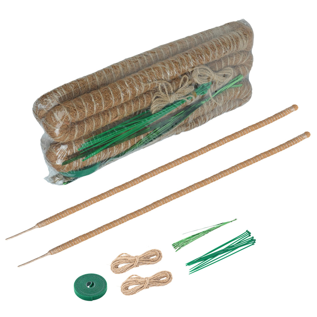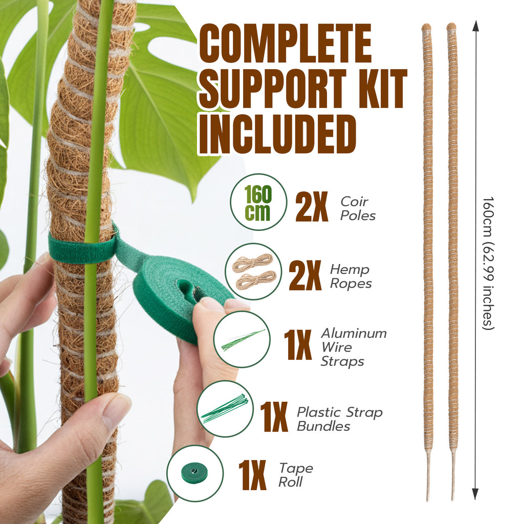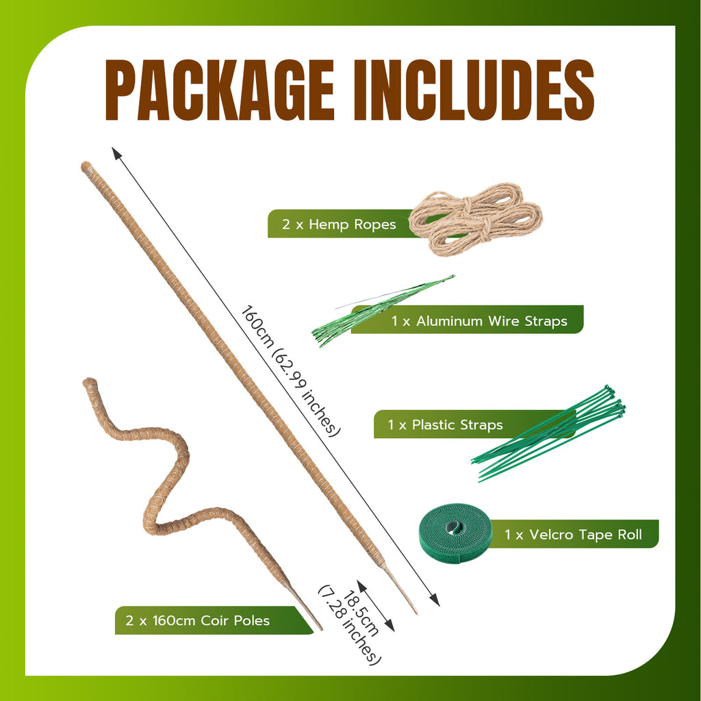 Complete Support Kit Includes: 2 x 120cm Coconut Poles, 2 x Hemp Ropes, 1 x Aluminum Wire Belts, 1 x Plastic Strap Bundles and 1 x Tape Roll. This set ensures that you have everything you need to properly support your climbing plants as they grow.