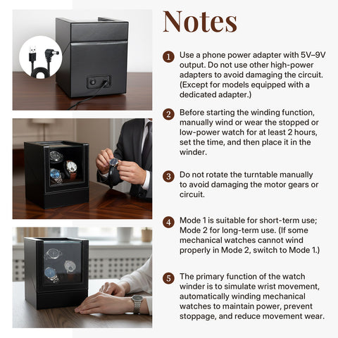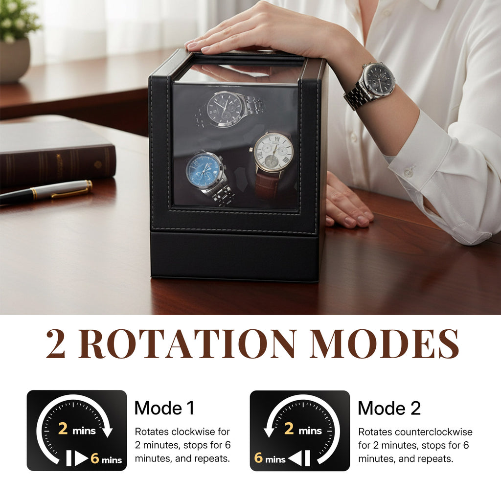 2 Professional Rotation Modes | Keep your prized automatic watches perfectly wound and ready to wear. Mode 1: Clockwise for 2 mins, rest for 6 mins. Mode 2: Counterclockwise for 2 mins, rest for 6 mins. Customize the care for your specific timepiece collection.