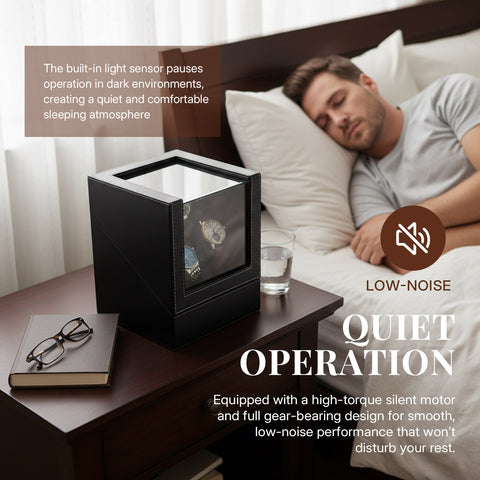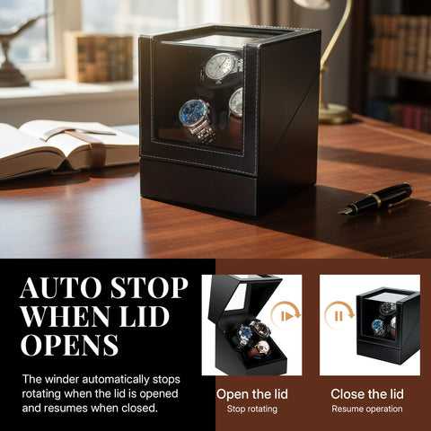Safety Auto-Stop & Easy Access Lid | The winder intelligently stops when the lid is opened and resumes when closed. This hassle-free feature makes changing watches or adjusting straps safer and more convenient than ever.
