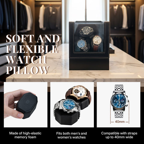 Universal Soft Memory Foam Pillow | Our high-elastic memory foam pillow gently cradles your watch to prevent scratches and scuffs. Easily adjustable to securely fit both men's and women's watches of various sizes, accommodating bands up to 40mm wide.