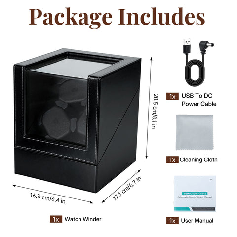 The Perfect Gift for Watch Lovers | Elegantly designed, this watch winder is not just a maintenance tool but a stylish display case for your collection. It's the thoughtful, practical gift for Christmas, Father's Day, Valentine's Day, or birthdays that will truly impress. What You Get | Your purchase includes: 1x Watch Winder, 1x USB to DC Power Cable, 1x User Manual, 1x Watch Cleaning Cloth