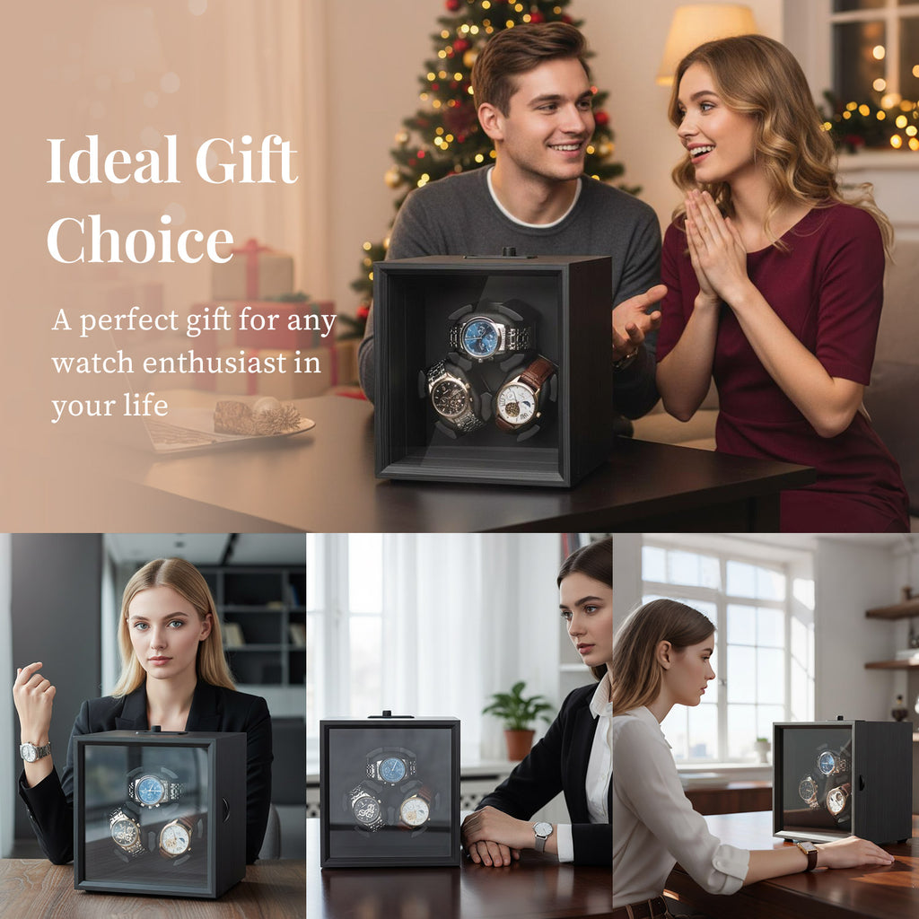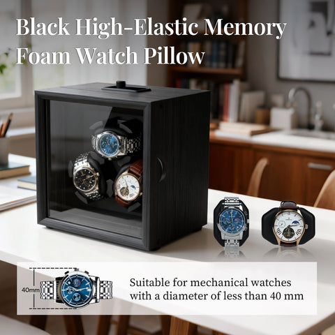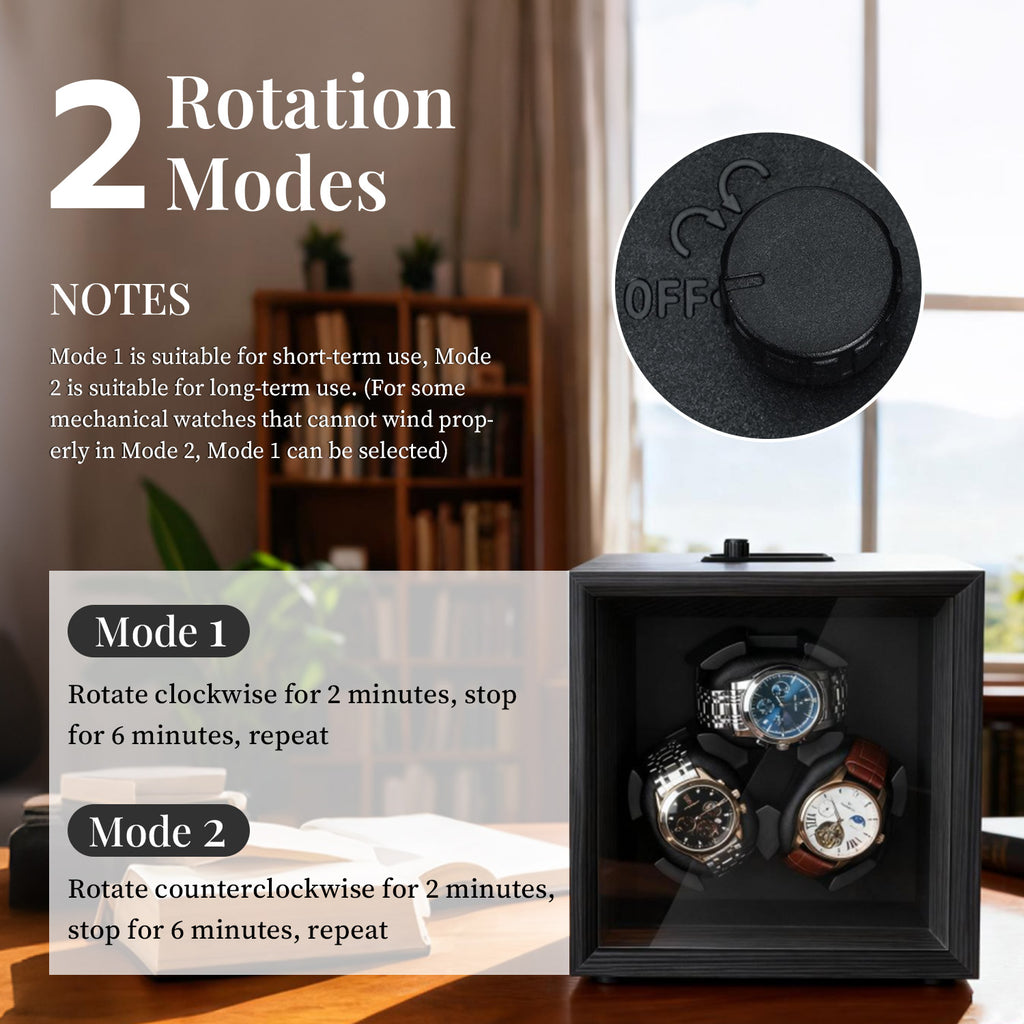 2 Rotation Modes: The watch winder offers 2 modes for professional care of your automatic watchesOpen-Lid Auto Stop: The winder automatically stops rotating when the cover is opened and resumes once it’s closed—no complicated operation required, making strap replacement easier. Quiet Operation: Equipped with a high-torque silent motor and full gear-belt bearing design for smooth, ultra-quiet performance that won’t disturb your rest. The winder features a light-sensing mode that automatically pauses operation in dark environments, creating a peaceful sleeping atmosphere.Soft & Flexible Watch Pillow: Made of high-resilience memory foam, the pillow gently wraps around the watch to prevent scratches. The soft and adjustable design fits men’s and women’s watches of various sizes, compatible with straps up to 40mm wide. Watches can be placed horizontally or vertically on the pillow.Soft & Flexible Watch Pillow: Made of high-resilience memory foam, the pillow gently wraps around the watch to prevent scratches. The soft and adjustable design fits men’s and women’s watches of various sizes, compatible with straps up to 40mm wide. Watches can be placed horizontally or vertically on the pillow.Usage Tips: 1. The main purpose of the watch winder is to simulate wrist movement to keep automatic watches wound, prevent stoppage, and reduce wear on the movement. 2. Mode 1 is recommended for short-term use; Mode 2 is ideal for long-term use. (If your watch cannot wind properly in Mode 2, switch to Mode 1.)