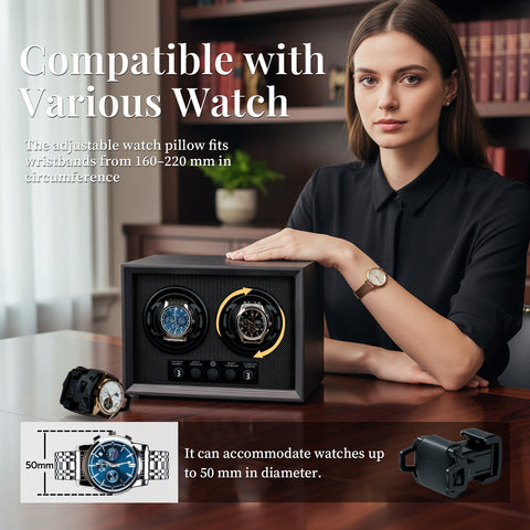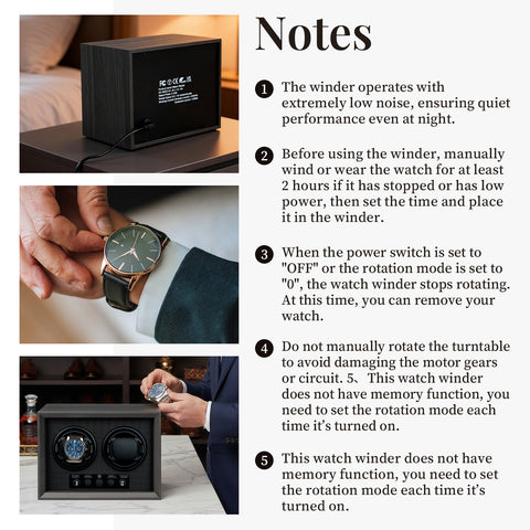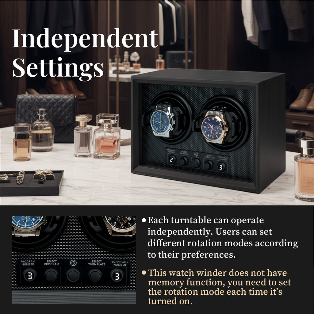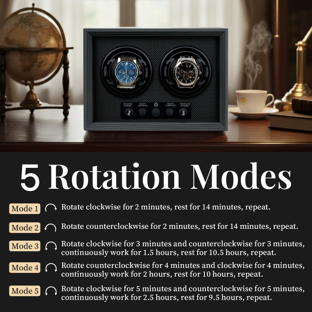5 Rotation Modes: This watch winder offers 5 programmable modes to provide professional care for your automatic watches.Personalized Settings: Each turntable can operate independently. Users can set different rotation modes according to their preferences. Press the right button to select the desired turntable (numbered 1–2 from left to right), then press the left button to set the rotation mode. Once all settings are completed, the winders will operate stably according to each individual mode.Quiet Motor: Equipped with a premium silent motor, the winder operates with extremely low noise, ensuring quiet performance even at night.Quiet Motor: Equipped with a premium silent motor, the winder operates with extremely low noise, ensuring quiet performance even at night.Perfect Gift Choice: This watch winder makes an excellent gift for fathers, husbands, boyfriends, bosses, friends, or any watch enthusiasts in your life.
