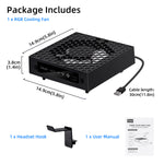 Headset Hanger Mount: Designed with a built-in headphone hook, this cooling fan serves a dual purpose, helping you organize and save space in your gaming area by providing a convenient spot to hang your headphones when not in use.