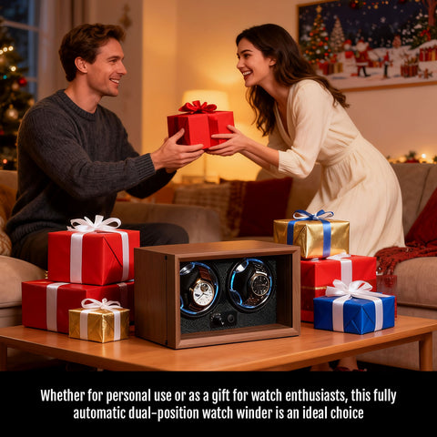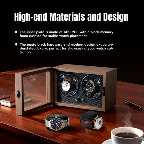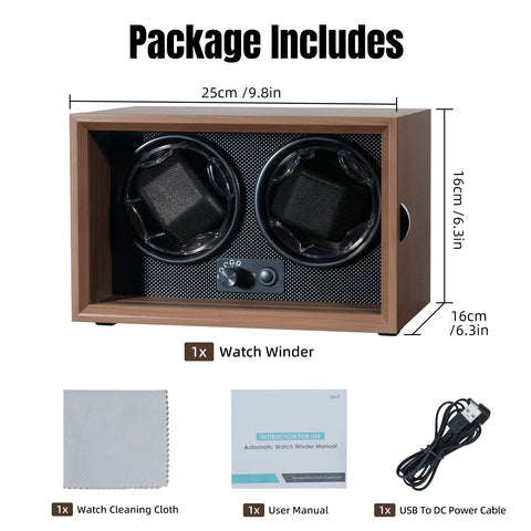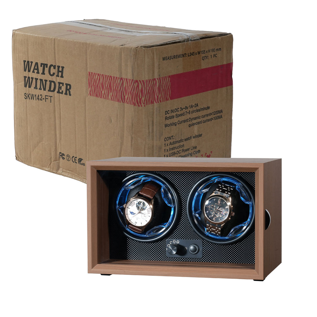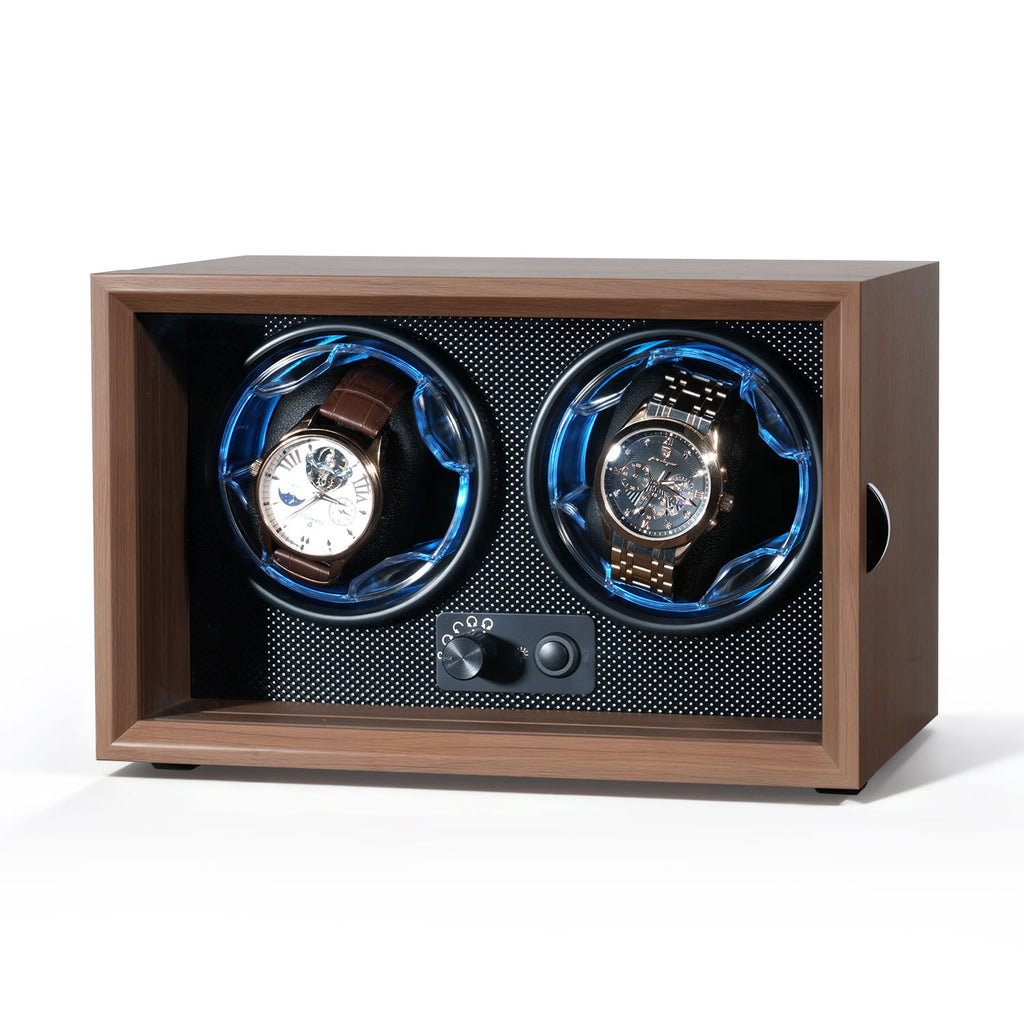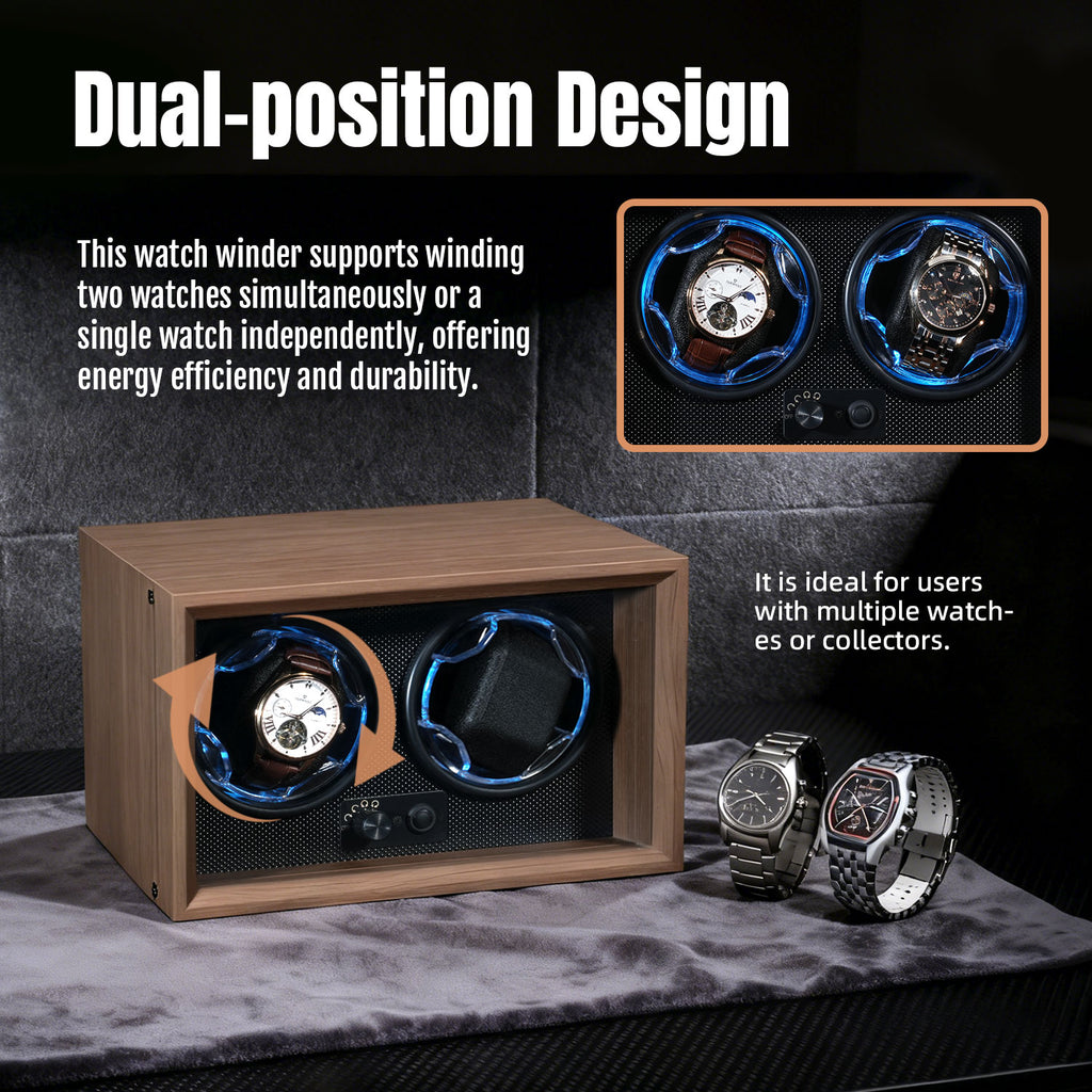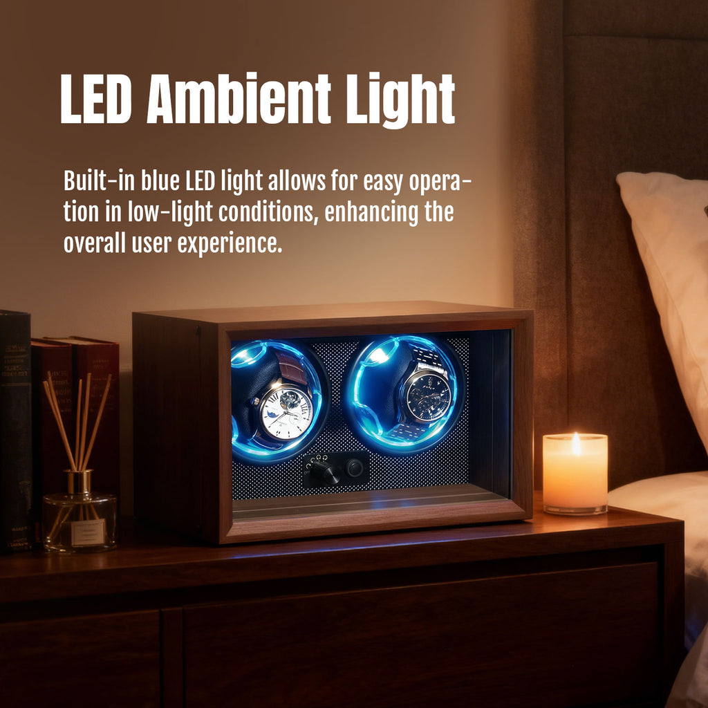 WHISPER-QUIET FULL-GEAR MOTOR – Engineered with an advanced ultra-quiet full-gear motor system, this winder offers superior durability and stability compared to belt-driven models. It operates silently (near 0dB), making it perfect for use on your bedside table without disturbing your sleep.4 ROTATION MODES & LED AMBIENT LIGHT – Customize your winding cycle with 4 distinct modes (Clockwise, Counter-Clockwise, Alternating, and Intermittent) to keep your mainsprings perfectly wound. A built-in cool blue LED light enhances the display, allowing you to showcase your timepieces elegantly even in the dark.4 ROTATION MODES & LED AMBIENT LIGHT – Customize your winding cycle with 4 distinct modes (Clockwise, Counter-Clockwise, Alternating, and Intermittent) to keep your mainsprings perfectly wound. A built-in cool blue LED light enhances the display, allowing you to showcase your timepieces elegantly even in the dark.USB POWERED FOR MAXIMUM FLEXIBILITY – Powered by an included USB-to-DC cable, this dual winder offers versatile placement options. You can easily power it using a standard phone wall charger, a power bank, or a computer USB port, making it ideal for travel, safes, or desktops where outlets are limited.